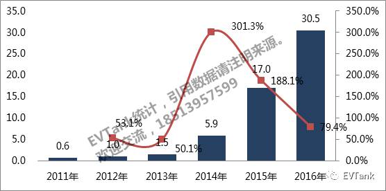 图 1 2011-2016年中国锂动力电池出货量:Gwh