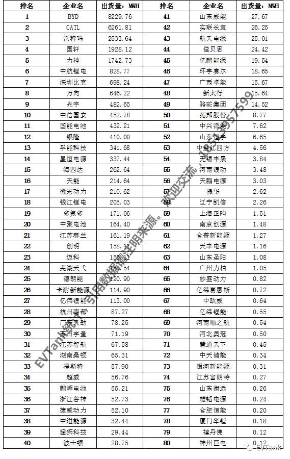 在EVTank发布的研究报告中,以附件的形式给出了中国主要动力电池企业排行榜,其排行榜依据为企业锂动力电池出货量。