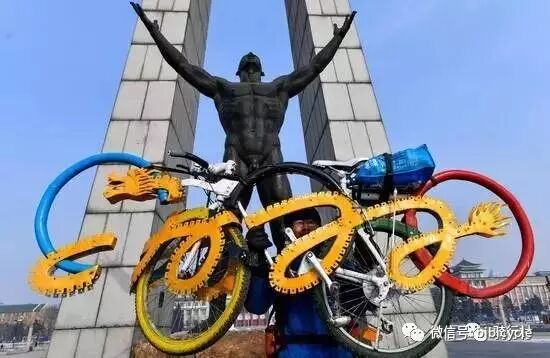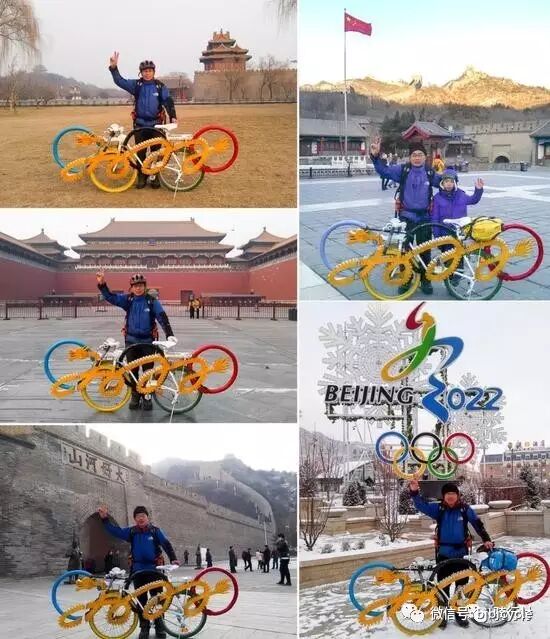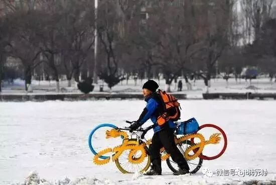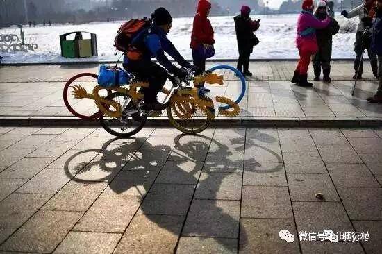 时隔近十年,孟杰又开始了他的第二次长距离骑行,这次是为了2022年在北京、张家口举办的冬奥会。“自行车在五环的基础上新加入了一条中国龙的元素,盘成 2022 的字样,代表着2022年冬奥会。”孟杰说。