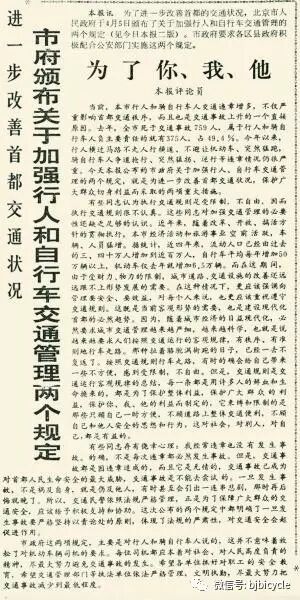 尽管此时北京路况显著改观,二环路、三环路一条接一条修起来,但面对自行车洪流,压力依然巨大。1986年4月,北京市政府发布《关于加强自行车交通管理的规定》:禁止逆行、在机动车道上骑行、争道抢行、骑车带人、追逐竞驶等违规行为。本报评论员文章《为了你、我、他》指出:自行车不是“自由车”。随着城市日益现代化,必然要求城市交通管理越来越严细,越来越要求人们有秩序、有准则地行车走路。那种想怎么骑就怎么骑的日子,已经一去不复返了。