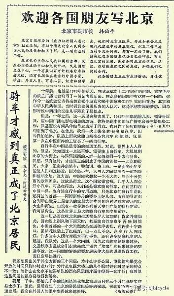 1987年,本报举办“威力杯外国人看北京”征文活动,各国专家学者、外交人员、媒体记者纷纷来稿,许多人浓墨重彩描绘了“自行车王国”的震撼。波兰专家莱舍克·阿达姆奇克写道:“自行车在中国是最普遍的交通工具。对此,世界上人人皆知。但是,光知道这一点还不够。需要骑上自行车,大胆地到北京的大街上,与熙熙攘攘的人群一起朝着同一个方向骑去。我想,只有这时,才能真正感到成了中国的首都——北京的居民。”