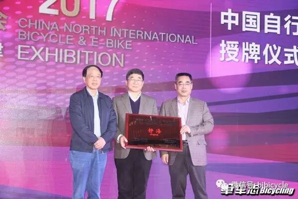 ▲静海成为“中国自行车电动车之都”授牌仪式从左到右中国自行车协会理事长马中超,静海区副区长信松印,静海经济开发区主任刘振福。
