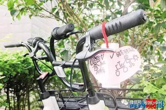 在盈翠里小区周边,有厦门市二实小、市实验幼儿园等学校。记者辗转了解到,单车上的卡片是与盈翠里小区相邻的市实验幼儿园大三班的小朋友制作并挂上去的。