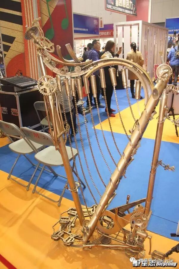 ▲天津理工大学艺术学院自行车主题造型设计展展品以自行车废旧零部件组成的艺术品。