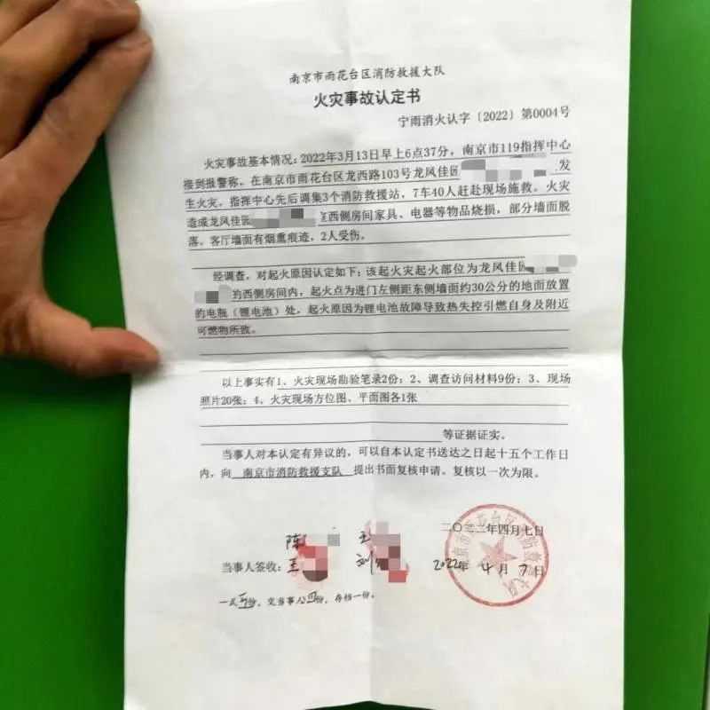 4月13日,陈某产的哥哥陈先生告诉北青报记者,近日,他已收到消防部门出具的火灾事故认定书。认定书显示,3月13日的火灾造成起火房屋西侧房间家具、电器等物品烧损,部分墙面脱落,客厅墙面有烟熏痕迹,2人受伤。经调查,该起火灾起火点是进门左侧距东侧墙面约30公分的地面放置的电瓶(锂电池),起火原因为锂电池故障导致热失控引燃自身及附近可燃物。