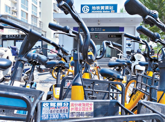 “我都找不出来一辆‘干净’车了。”在地铁6号线黄渠站外,每天早晚高峰都码放着大量的共享单车,现场采访时便能听到这样的抱怨。市民王先生说,他平日靠共享单车解决“最后一公里”,几乎每天都骑。车上被贴非法小广告的问题虽然由来已久,但他发现自打今年开春,这个问题越发严重了,有时站外的共享单车几乎都被贴上了非法小广告。