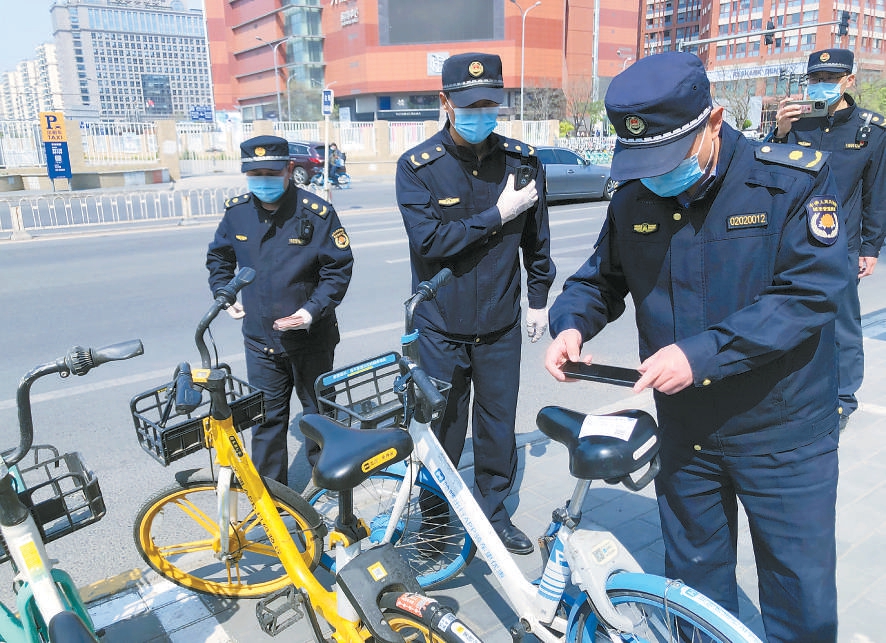 4月18日城管执法部门对共享单车车身非法小广告现场取证。