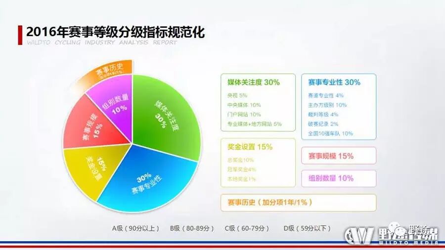 2016年,野途通过媒体关注度、赛事专业性、奖金设置、赛事规模、组别数量以及赛事历史等多维度,对业余自行车赛事进行分解,分级指标更加规范。