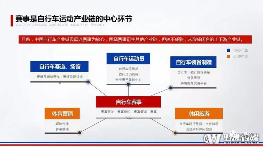 中国自行车产业链发展以赛事为核心,围绕赛事衍生出自行车装备制造、自行车运动员、自行车赛道场馆、体育营销和休闲旅游等其他产业链,但较不成熟,未形成闭合的上下游产业链。