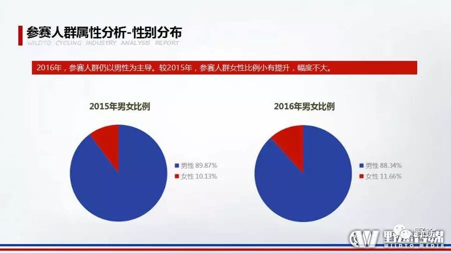 2016年,参赛人群仍以男性为主导。较2015年,参赛人群女性比例小有提升(从10.13%上升到11.66%),幅度不大。