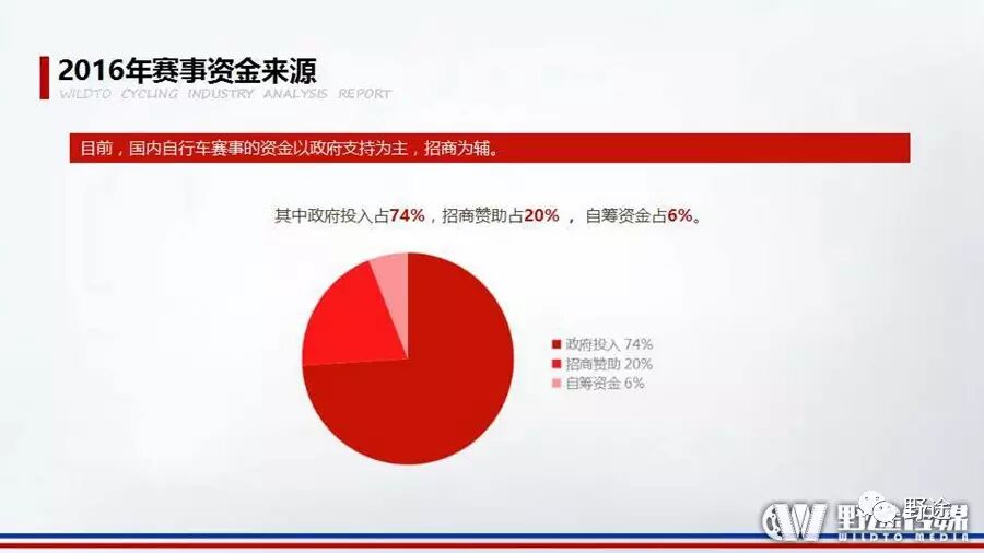 大型赛事多由地方政府主导组织举办,极少有社会团体、商业机构发起。小规模赛事及活动由社会团体、商业机构发起较多。与之匹配的是,国内自行车赛事的资金以政府支持为主,招商为辅。其中政府投入占74%,招商赞助占20% ,自筹资金占6%。