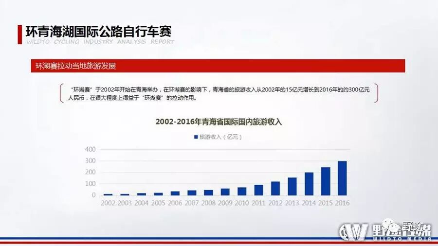 其中,已经连续举办15届的环湖赛,2016年共吸引了23支职业车队参加,总奖金高达100万美元。在环湖赛的影响下,青海省2016年的旅游总收入约300亿人民币,在很大程度上得益于“环湖赛”的拉动作用。