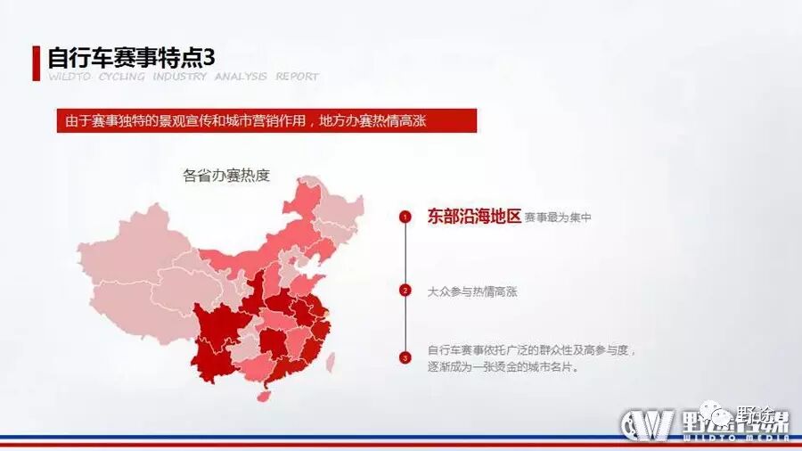 2016年,中国业余自行车赛事总体体现如下特点:赛事数量增速减缓;核心参赛人群数量增加;赛事由量变向质变的转变,赛事更加规范化;赛事组织仍以政府主导为主。