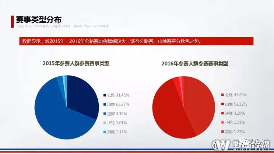 《报告》显示,较2015年,2016年公路赛比例增幅较大,渐有公路赛、山地赛平分秋色之势。