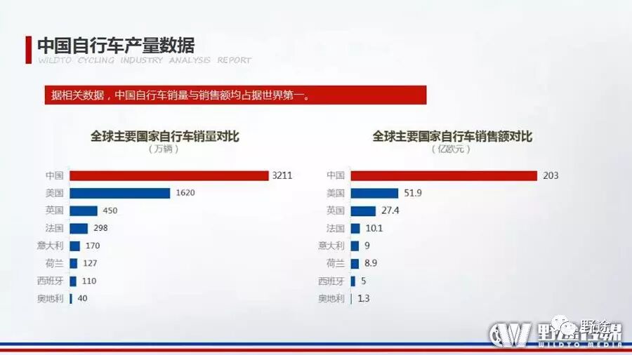 根据中国自行车协会统计,2016年我国自行车总产量为8513.8万辆,累计实现主营业务收入1639.7亿元,其中两轮脚踏自行车主营业务收入638亿元。中国自行车销售量与销售额,分别以3211万辆和203亿欧元,占据世界第一。