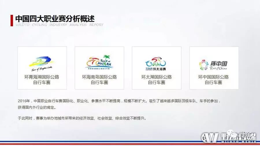 以环湖赛、环岛赛、环太湖和环中国这国内四大职业赛为例,2016年,赛事国际化、职业化、参赛水平不断提高,规模不断扩大。吸引了越来越多国际顶级车队、车手的参加,获得国内外行业的肯定。与此同时,赛事为举办地城市所带来的经济效益、社会效益、综合效益不断提升。