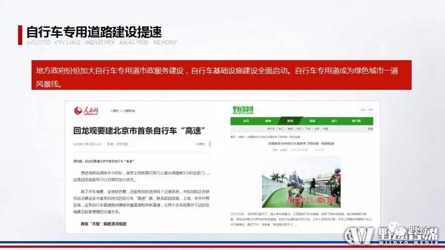 自行车运动也在2016年迎来了爆发。里约奥运会,宫金杰,钟天使摘得中国自行车史首金,这打破中国自行车运动奥运零金牌记录;巨头纷纷进入自行车运动领域,其中,万达集团在这一年对外宣布,2017年将举办环广西自行车世巡赛,并获得格力的鼎力赞助;而阿里体育2017年将承办海南环岛国际公路自行车赛。地方政府纷纷加大自行车专用道市政服务建设,自行车基础设施建设全面启动,自行车专用道成为绿色城市一道风景线。厦门建成全国首条空中自行车道,北京回龙观也要建设北京首条自行车高速公路。