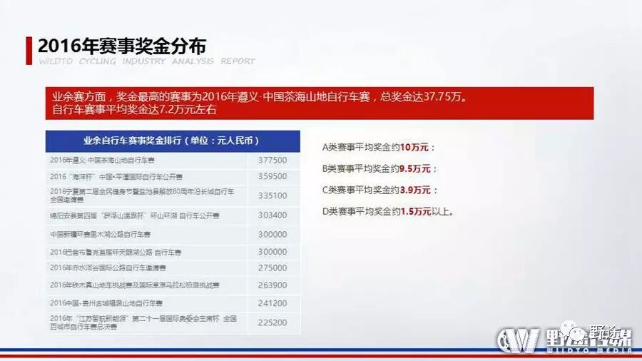 2016年,业余自行车赛平均奖金达7.2万元/场,其中A类赛事平均奖金约10万元;B类赛事平均奖金约9.5万元;C类赛事平均奖金约3.9万元;D类赛事平均奖金约1.5万元以上。