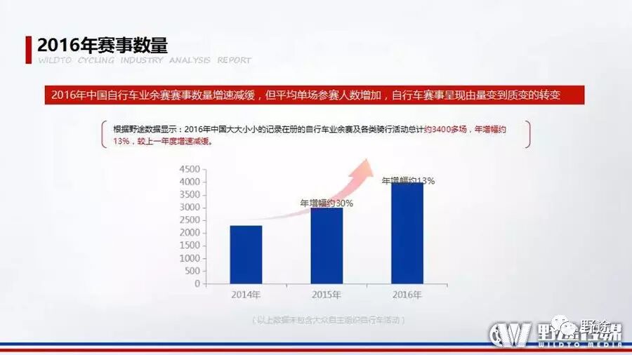 《报告》显示:2016年中国大大小小的记录在册的自行车业余赛及各类骑行活动总计约3400场,年增幅约13%,较上一年度增速减缓。