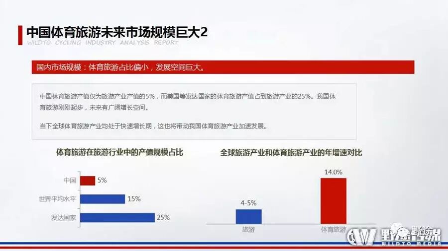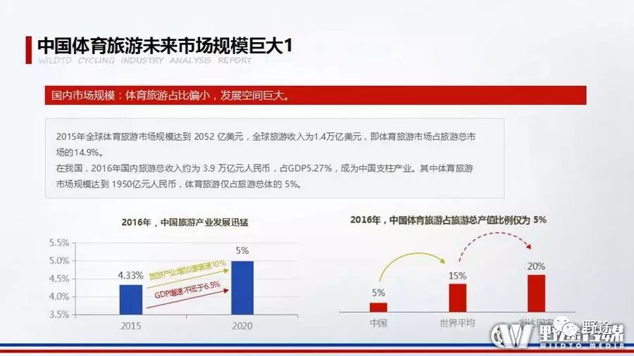 2016年国内旅游总收入约为 3.9 万亿元人民币,占GDP5.27%,成为中国支柱产业。其中体育旅游市场规模达到1950亿元人民币,体育旅游仅占旅游总体的 5%。而美国等发达国家的体育旅游产值占到旅游产业的25%,我国体育旅游刚刚起步,未来有广阔增长空间。当下全球体育旅游产业均处于快速增长期,这也将带动我国体育旅游产业加速发展。