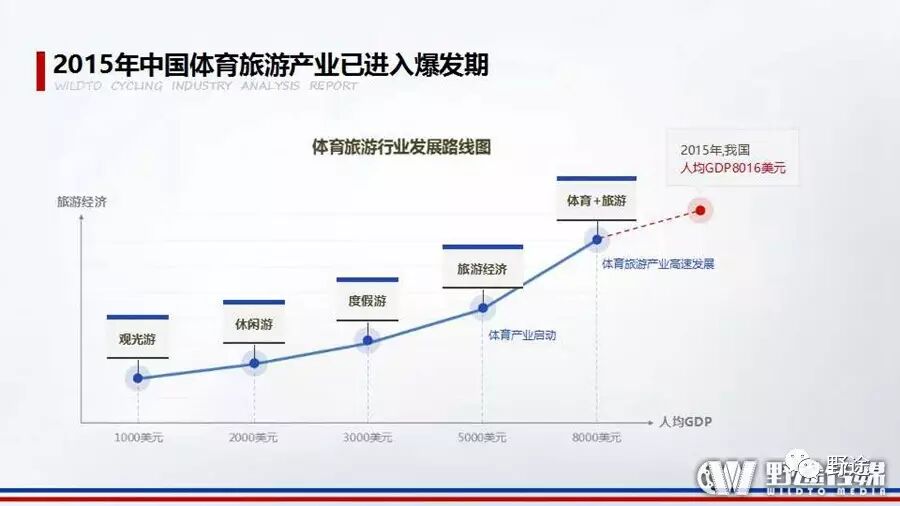 根据相关研究,当人均GDP达到8000美元时,体育+旅游将迎来爆发期,而我国人均GDP在2015年就已突破8000万美元大关, 中国体育旅游产业已进入爆发期。根据国家旅游局、国家体育总局关于《大力发展体育旅游的指导意见》,到2020年,中国体育旅游总消费规模突破1万亿元。