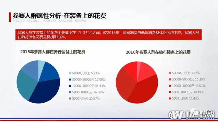 参赛人群在装备上的花费主要集中在1万-3万元之间。较2015年,高端消费与低端消费整体比例均下降。参赛人群在骑行装备花费呈橄榄形分布。