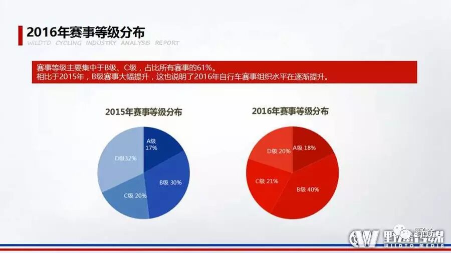 相比于2015年,B级赛事大幅提升,这也说明了2016年自行车赛事组织水平在逐渐提升。